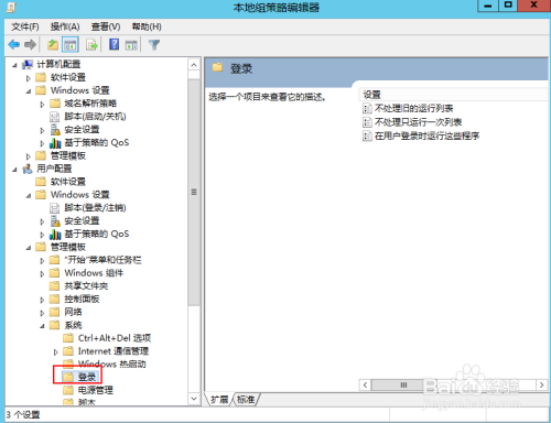 3、组策略:在运行中输入 gpedit.msc,打开组策略,打开“用户配置-管理模板-系统-登录”,配置“在用户登录时运行这些程序”即可。